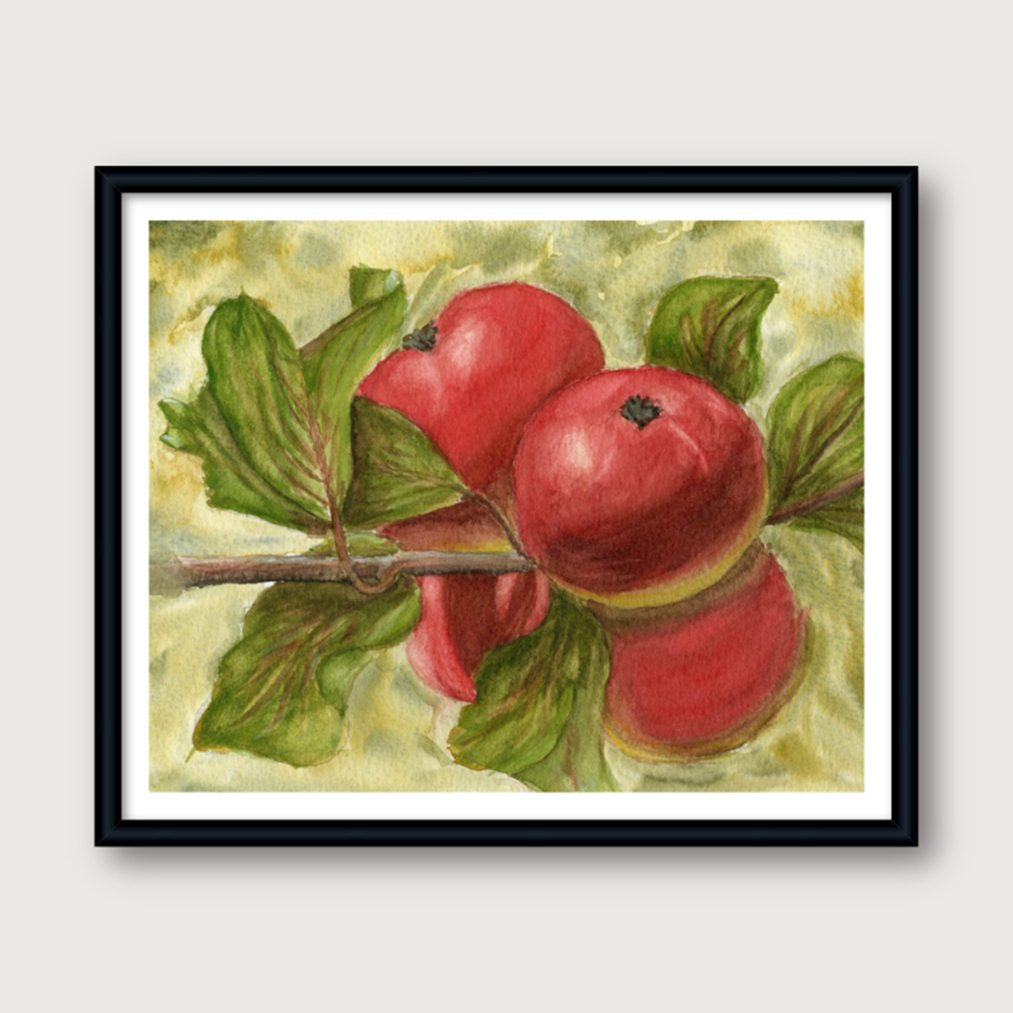 Bring the warmth of the orchard into your home with this botanical watercolor of apples on the branch. Printed on premium archival paper and available framed or unframed, this timeless piece adds natural charm to kitchens, dining rooms, and cozy living spaces. Free U.S. shipping included.