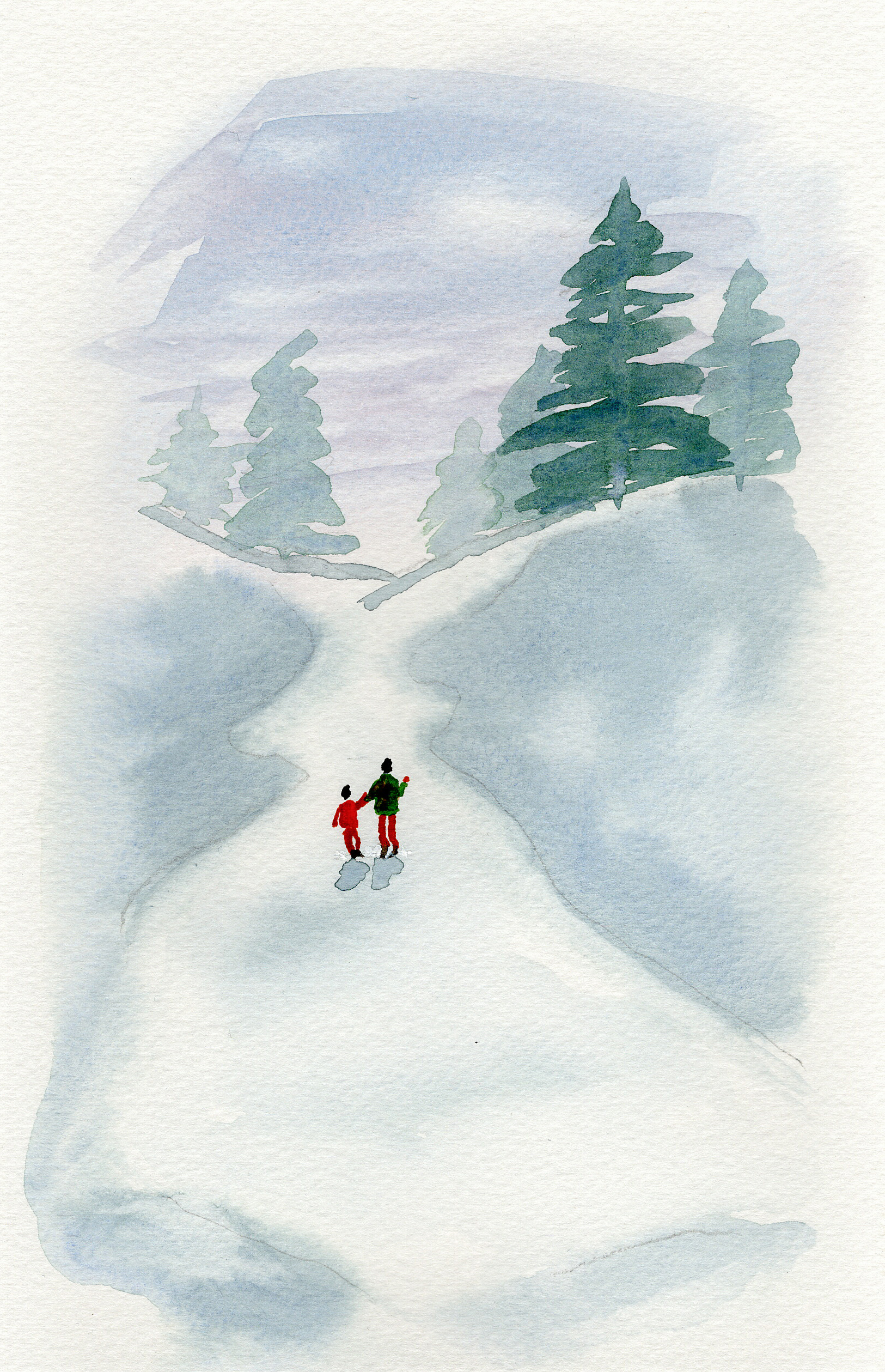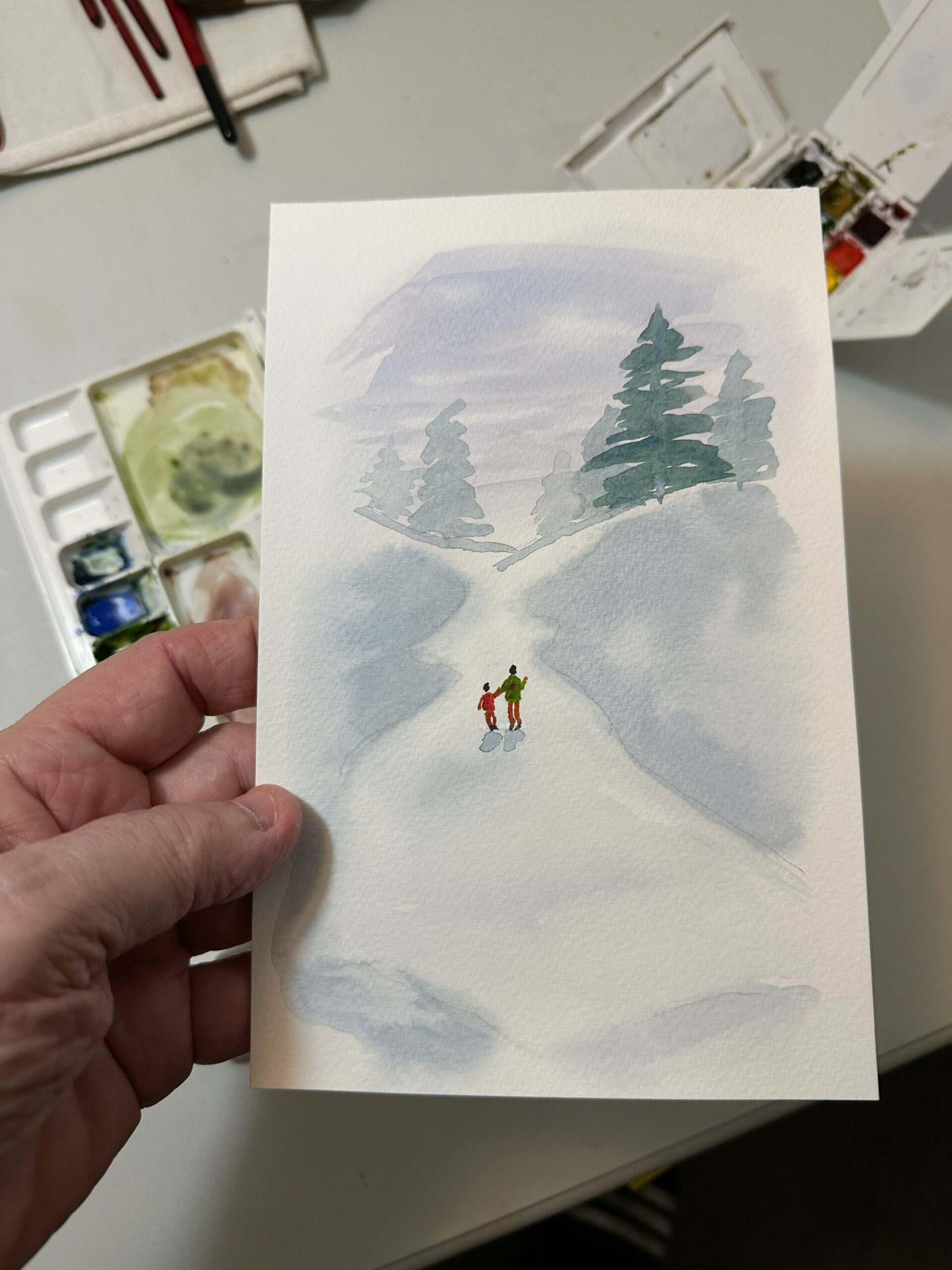 Amid soft snow and muted trees, two small figures bring warmth to a quiet winter path — a reminder that even in stillness, color is its own kind of light.