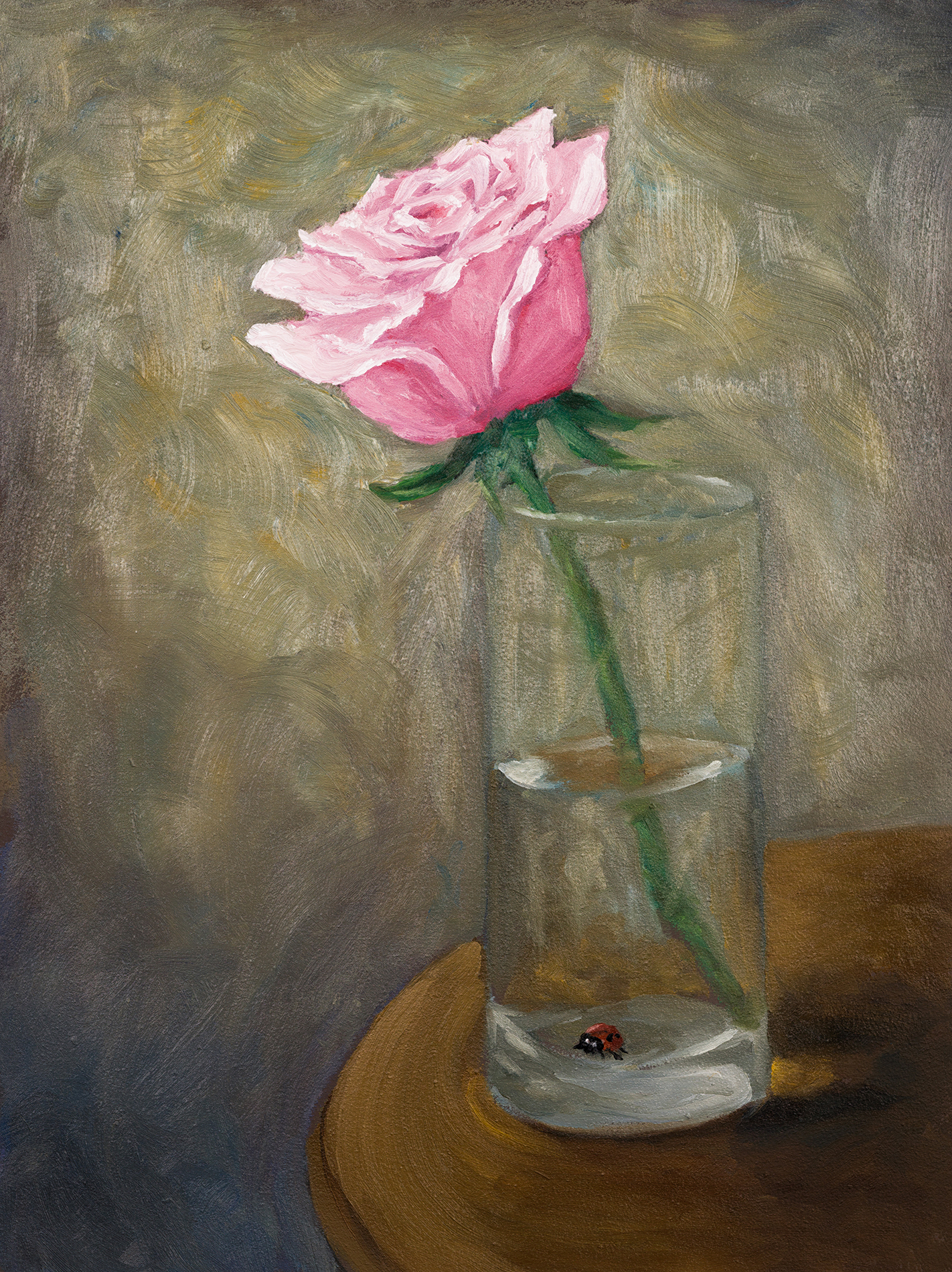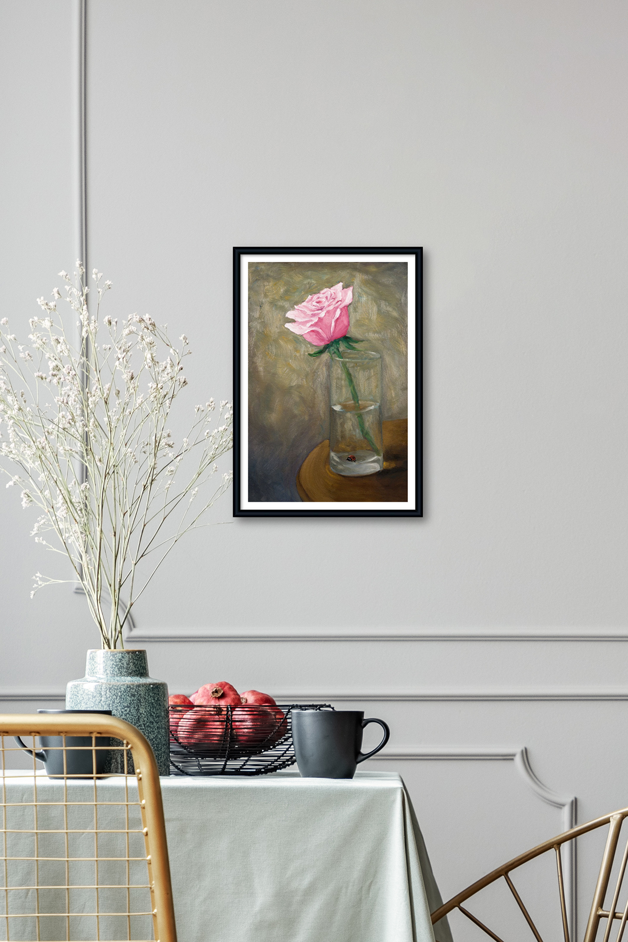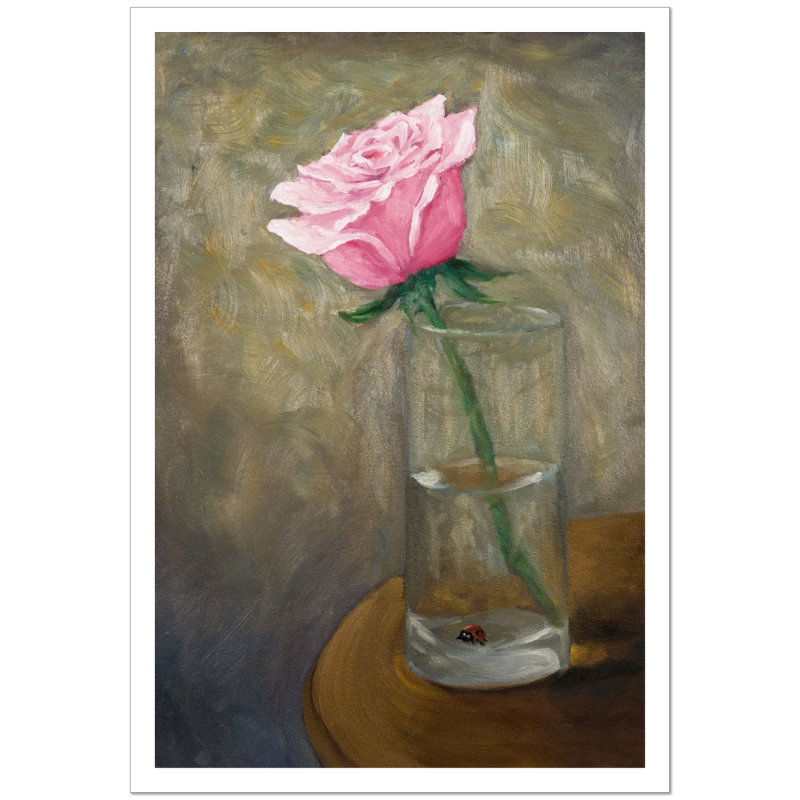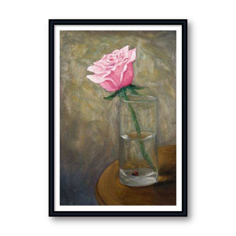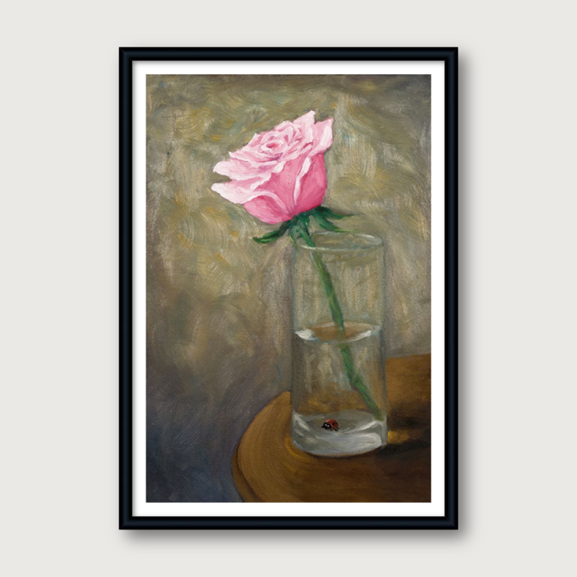 This gentle still life captures the quiet elegance of a single pink rose leaning gracefully in a glass of water, with a tiny ladybug resting at the base—an unexpected, charming detail that adds warmth and personality. Soft brushwork and muted background tones create a peaceful, intimate mood that complements both traditional and contemporary interiors.