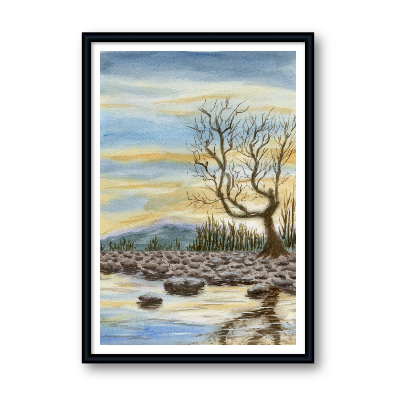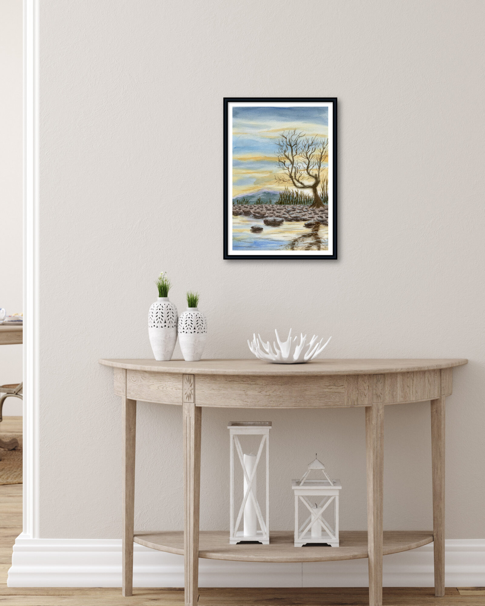 Painted in watercolor, this piece focuses on balance and restraint, allowing space, reflection, and subtle color to carry the emotional weight. It’s a work meant to settle into a room rather than announce itself.