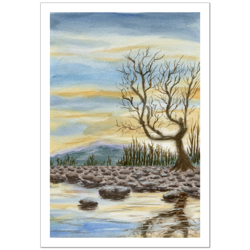 Quiet Reflection is a study in stillness. A bare tree stands at the water’s edge, mirrored in calm shallows beneath a softened sky. The moment is unhurried — an invitation to pause, breathe, and notice what remains when the world grows quiet.
