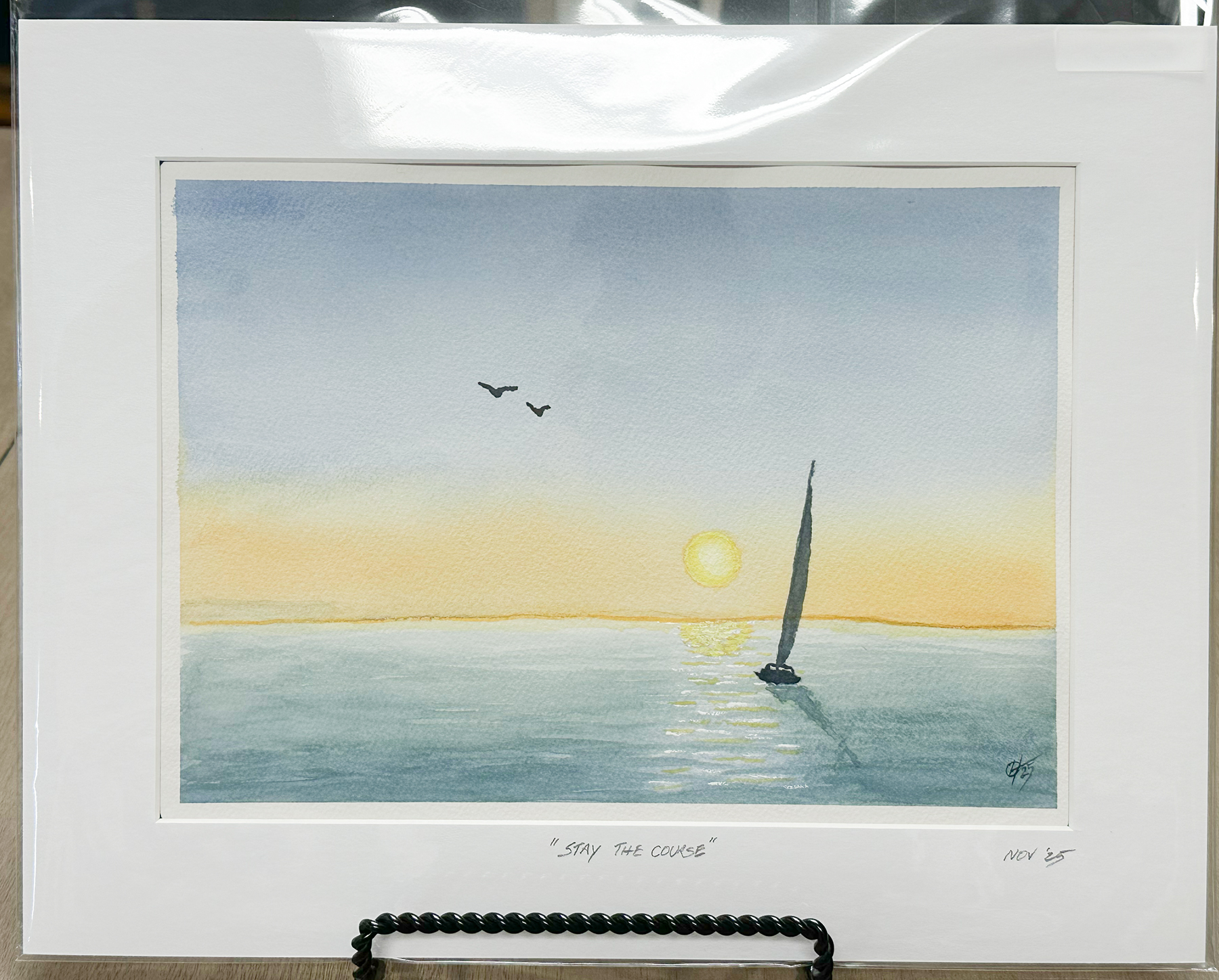 In Stay the Course, a single sailboat moves steadily toward the light — a simple, elegant symbol of perseverance and peace. The soft blending of sky and water captures the meditative calm of evening on the water, inviting reflection and stillness.