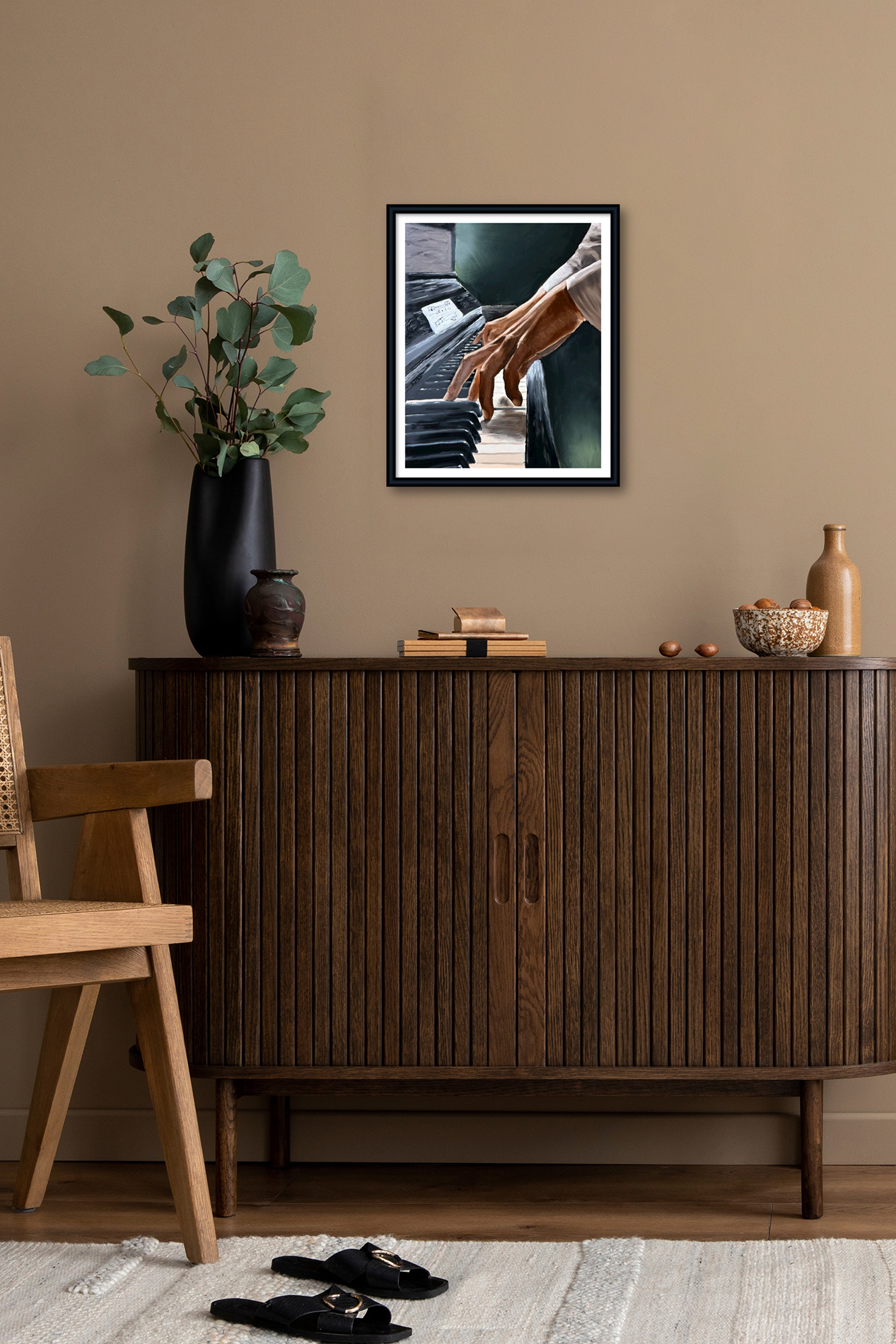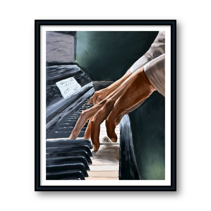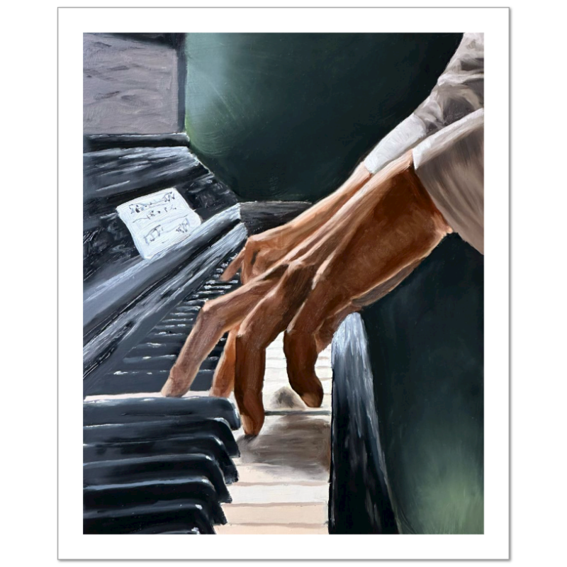 This expressive fine-art print captures the intimate moment where music begins—at the fingertips. The close, angled view focuses on the pianist’s hands as they reach for the next note, revealing tension, grace, and the physical poetry of playing.